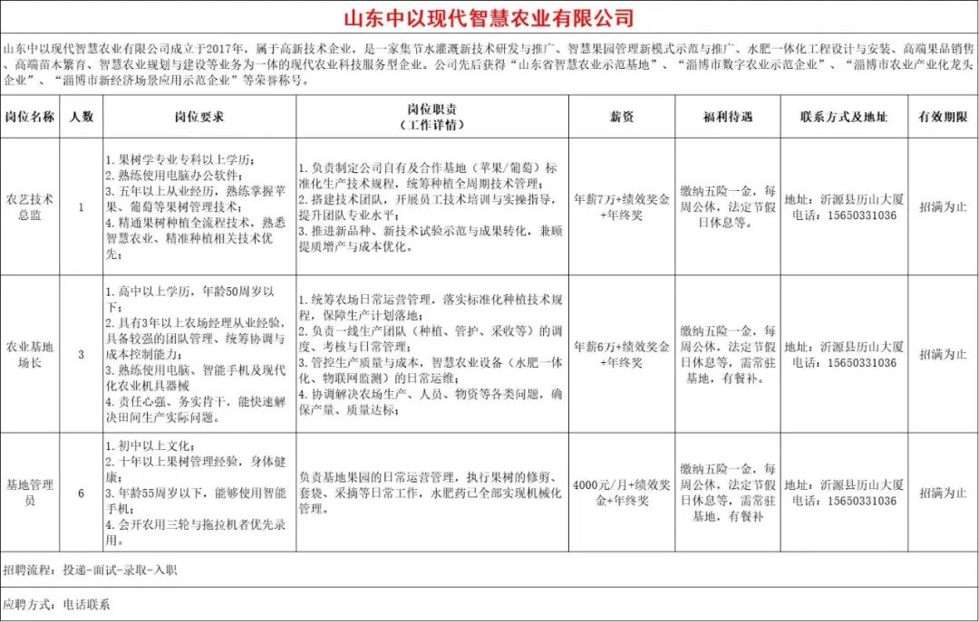 山东中以现代智慧农业有限公司招聘农艺技术总监,农业基地场长,基地管理员…