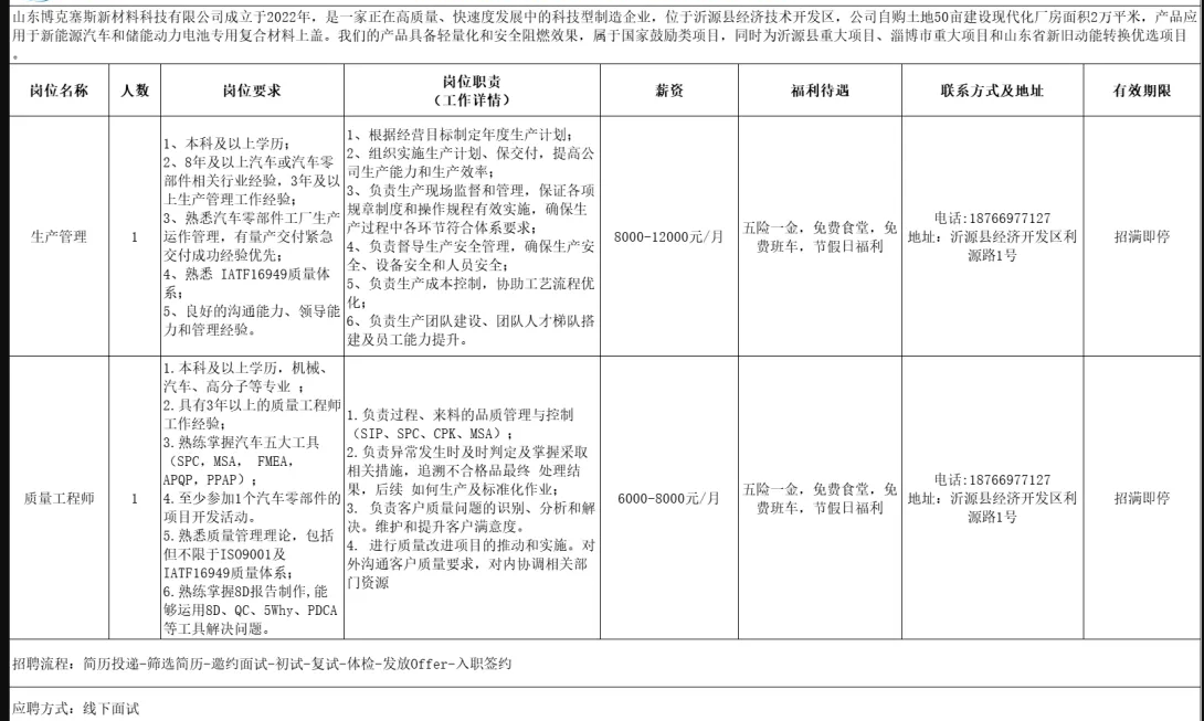 山东博克塞斯新材料科技有限公司招聘生产管理,质量工程师…