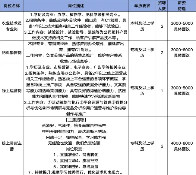 淄博乐悠悠农业科技有限公司招聘农业技术员专业人员,肥料销售,线上运营,线上带货主播福利待遇:保险+单休+提成+节假日福利联系人:马经理地址:淄博市张店区金晶大道…